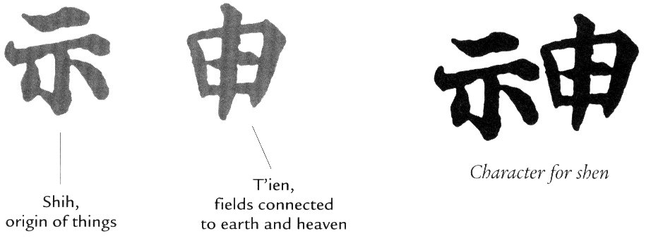 Reading the Chinese LettersThe character for Shen is made up of Shih, which means the origin or highest order of things. In brief, it depicts those things coming from heaven, the sun, moon, and stars. Next to it we see T'ien, which depicts a field, or paddy. The vertical line running through it symbolizes the connection of heaven and earth. The implied meaning here is the origin of things (Shih) that connects people to heaven and earth and that is found in the fields from which sustenance is got. People can connect themselves to physical fields, human fields, and heavenly (spiritual) fields.